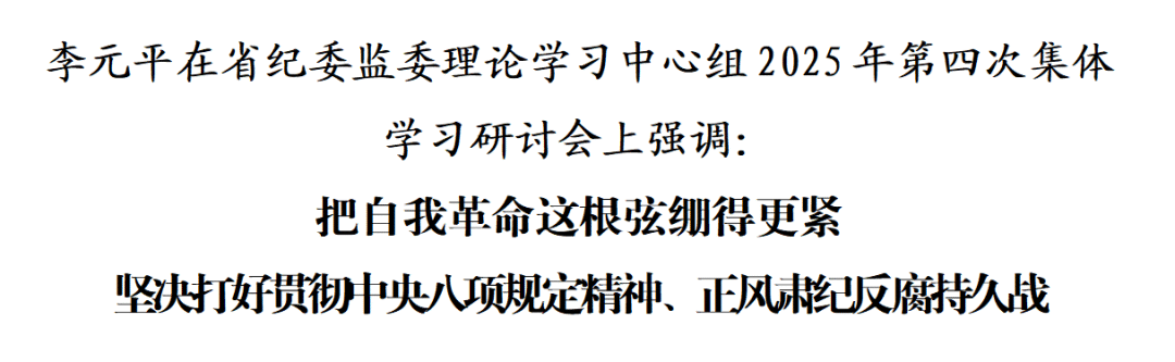 李元平强调,要进一步深化对形势任务的认识,切实把自我革命这根弦绷得更紧,坚定不移以党的自我革命引领伟大社会革命,以更大魄力将党风廉政建设和反腐败斗争抓到底、严到底。
